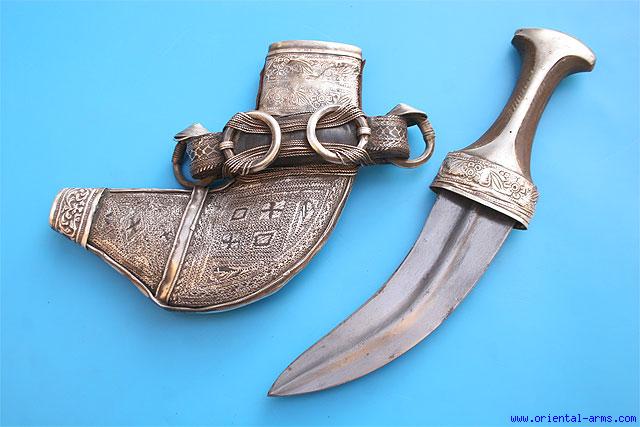 A good Arab Khnjar / Jambiya dagger, late 19 to early 20 C. from Oman. It has an 6 ½ inches curved and dual edge well forged blade with a pronounced central rib. The grip is horn decorated with a silver front panel and mounted with chased silver collar. The scabbard is “L” shaped covered with leather elaborately embroidered with silver strips and wires, and mounted with chased filigree silver locket en suite with the hilt mounts. The belt attachment is made of complicate arrangements of silver rings and twisted silver wire. Total length is 12 inches. Good condition. Blade with scratches. Minor dents on the silver mounts.