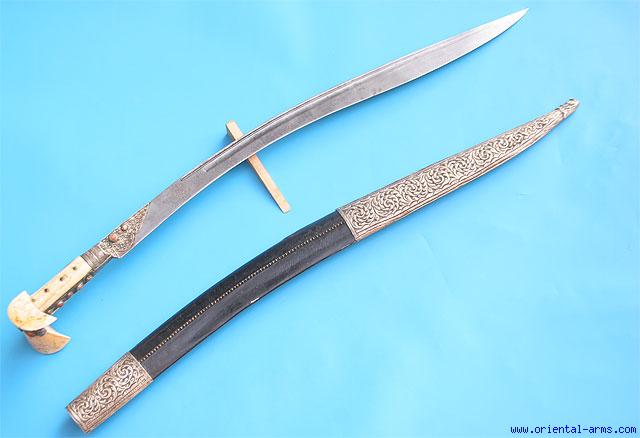 Here we offer a very Large 19C Ottoman Yataghan from the Balkans. It has a 27 1/2 X 1 3/4 inches blade with good deep maker mark and silver koftgari work (worn). Large Walrus grips of typical form with gilded copper bolsters and grip strap with large corals (partialy cracked). Original scabbard with leather cover and spiral stitching and nice chased silver mounts. Total length 35 inches. Very good condition. |