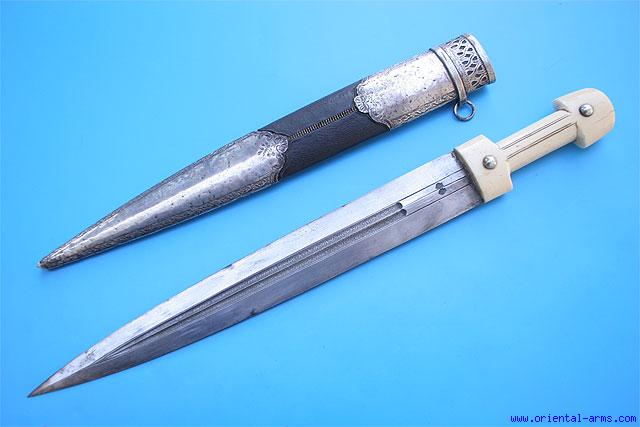 Up for sale is this fine and rare 19C. Turkish style Qama short sword. The heavy wide blade is 17 inches long and 2 inches wide, with two fullers with etched design, stamped with maker marks on both faces. Massive walrus handle with silver rivet caps. The scabbard is wood covered with leather with spiral stitching and mounted with big. silver locket and chape. Total length 25 inches. Very good condition. Minor chip on the ivory. A fine complete item.