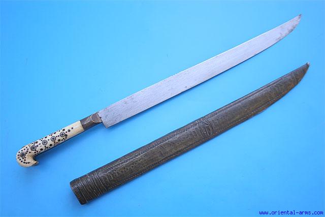 An unusual long knife from Bosnia & Herzegovina, from the very short period of independence before the annexation to the Austro-Hungarian Empire at the end of the 19th C. The blade is straight, single edge, 14 inches long (compared to 7-9 inches long of the more common ones) and marked with a maker mark in the shape of a small saber. The grips are bone with flared pommel, set with brass nails and inserts in a typical Balkan style of decoration. The scabbard is wood covered with thin chased brass. Total length 19 inches. Very good condition. To demonstrate the unusual length it is shown below next to a similar regular knife with 8 inches blade. |