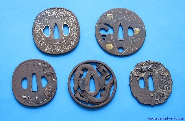 Up for sale this lot of five Tsuba cross guards for Japanese swords, all coming from an old collection. Diameters: 70 – 85 mm. All steel with copper, silver and gold inlay. Very good condition.