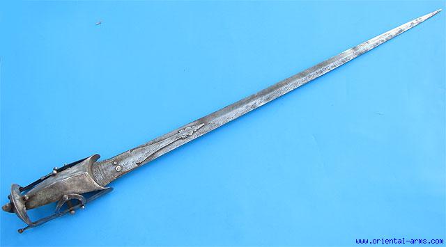 A very old version of the famous Kattar (Katar). A development stage between the Pata, the long gauntlet sword and the Kattar, the short push dagger. Very long and narrow blade of diamond cross section, 31 long. The cross bars are shaped like small balls. The handle is protected with a steel hood terminating in a styled monster head shaped tip. 38 inches total length. To demonstrate the length, it is shown here next to a common size kattar push dagger. Good condition to age. Minor losses on the handle . |