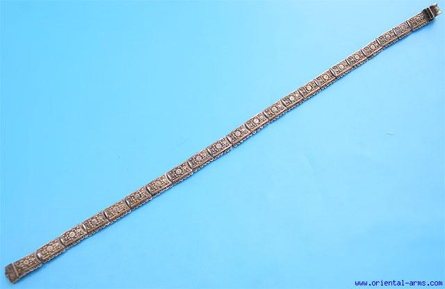 Not exactly a weapon but a fine example of Caucasian silver art, this silver belt is from the late 19 C., including 22 links of very finely chiseled, nielloed and gilded silver including the buckle parts. Total length 33 inches. Very good plus condition. |
