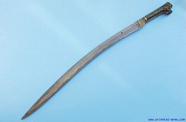 A good example of a classical “YATAGAN”. This specific example is of Turkish origin, but was re-hilted probably by an Arab owner with an Arab style decoration. The 23 inches long blade is finely forged from pattern welded (Damascus) steel in the pattern known as Turkish Ribbon and stamped with a maker sign. The grips with the side ears are carved from dark horn and set with many brass nails (as common in various Arab swords/daggers hilts. The blade collar and the grip strap are brass. Good plus condition. Minor damage to the grips and few brass nails are missing. A very nice example at a very reasonable price. |