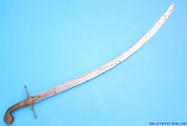 This 19 C. saber is shaped in the style of a Turkish sword but it is most probably a local Arab made sword from Israel, Jordan or Syria. The blade is well forged and fullered, 32 inches long with 8 inches back edge. The blade is marked and inscribed on both faces, with what may be IANGANI. We are not sure about the meaning of this markings. Horn grip with bulbous pommel, brass grip strap and brass cross guard. A twisted brass wire binding is holding the cross guard in place. Total length 38 inches. Very good condition. Blade slightly bent and with few blackened spots and age cracks on the horn grips. This sword comes with its original wood scabbard , unfortunately badly damaged (Not shown) |