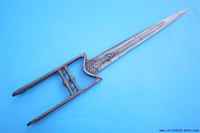 This early Kattar push dagger is coming from India, probably Deccan or South India, 17C or earlier. Massive blade with central rib 12 inches long with slightly thickened tip. The blade is riveted to a steel handle with finely chiseled handle with pierced flared side bars. Total length 19 ½ inches. Very good condition to age. Minor pitted spots. Rare and very good item. |