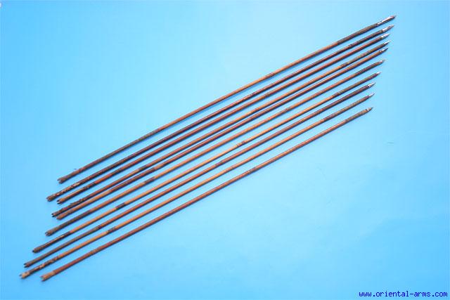 This lot of arrows is of Indian origin, late 18 or early 19 C. It includes 8 hunting arrows with small steel tips and two battle arrows with bigger armor piercing heads. The shafts are made of bamboo and nicely decorated below the blades, Blades ½ - 2 inches, Total length 28-30 inches. |