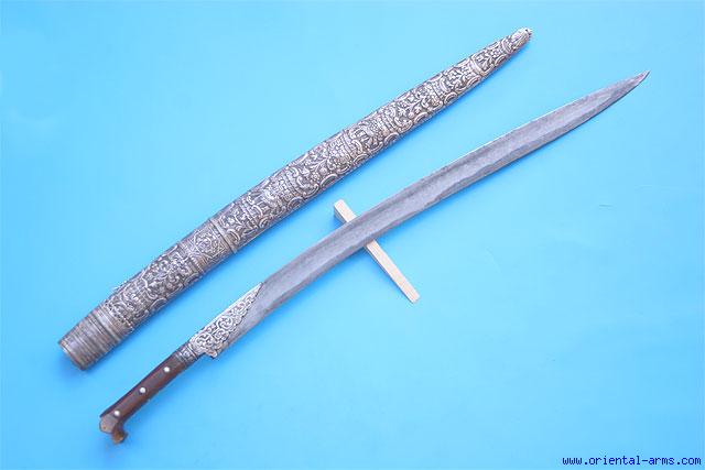 This rare form of Yataghan, with the lobed pommel is usually identified as North African, probably Algeria. In addition, most of these Yataghans will come with rhino horn hilt grips, as is the case here. Fine down curving blade, 24 inches long, forged from pattern welded (Damascus) steel in the pattern knows as Turkish Ribbon. The grips are rhino horn and the grip strap and bolsters are silver covered pewter. The scabbard is whole silver very finely chased. Total length 30 inches. Very good and complete condition. Minor losses to the silver cover on the grip strap |