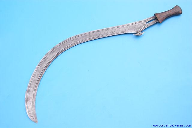 Up for sale this fine and long sickle shaped sword of the Azande from central Zaire (also used by the neighboring tribes, Boa and others). Early to mid 20 C. 21 ½ inches blade sharpened on the concave side, flat diamond cross section on one face and nicely engraved with geometrical design on the other face. and with a 7 inches double edge tip. Wood handle. Total length 31 ½ inches. Very good plus condition. Hard to find African authentic weapons of this fine quality and condition. |