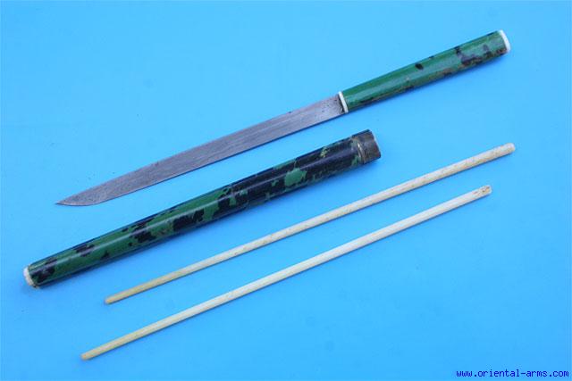 A Chinese ‘trousse’ (eating set), comprising a knife and chopsticks. This type of sets was very common in china and in all the countries under the Chinese influence from Tibet to Mongolia. It was part of a man formal dress up to the turn of the 20th century and usually accompanied with a variety of accessories like pickle spear, toothpicks, tweezers and the like. Similar sets are found in various sizes and quality. This one has a 6 inches finely forged and laminated steel blade. The handle and the scabbard are wood (probably Bamboo) covered with green dyed tortoise shell like cover with ivory tips. Chopsticks are bone. Total length 10 ½ inches. Very good condition |