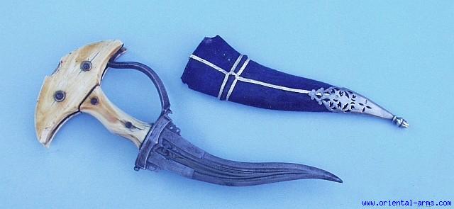 This Khanjarli is a very rare form of Indian Khanjar with a strongly re-curving 8 inches multi-fullered blade of wootz (Damascus) forge. The lunette shaped pommel and grips are Ivory with good patina. Very good condition. Several small areas of chipped ivory, newly made scabbard. This is a rare 18 Century (or earlier) piece rare and authentic piece.