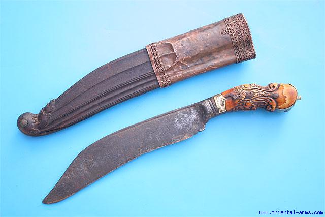 Up for sale is this early, 18C. or earlier, very good “PIHA KAHETTA” the traditional knife of the Sinhalese from Sri-Lanka (Ceylon). It has a single edged short heavy blade, 8 inches long with a down curving tip. The grips are beautifully carved from ivory with dark, shining age patina. Brass bolsters and pommel cover. Original wood scabbard with copper locket with filigree decoration. Total length is 15 ˝ inches. Good condition. Very fine darek age patina on the ivory grips. Blackened spots and minor patches of pitted areas on the blade. |