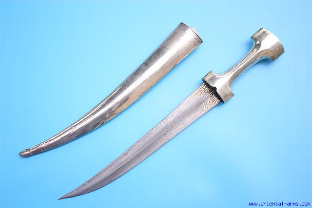 This Jambiya dagger is from the Balkan region of the ottoman empire, may be Albania, mid 19 C. Good blade well forged from Sham steel (Low contrast wootz steel) 13 inches long, with medial ridge and Arabic inscription in gold inlay work. Whole silver handle and scabbard, with a silver proof mark (Tughra ) on the back of the scabbard. Total length 21 inches. Very good condition of scabbard and handle. A good polish is needed for the blade which is unfortunately scratched. |