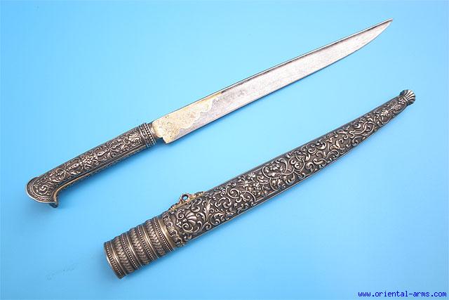 As best as it can get: This Bichaq knife is made by Manceaux a Paris. It is made for the Turkish market, probably to be acquired by a top official or high ranking officer. It is of utmost quality in all aspects: Blade forging and silver work. The blade is forged from very fine and delicate twisted steel in the pattern known a Turkish ribbon. It is 9 inches long with gold inlay work at the base. The handle and scabbard are made from heavy silver with extremely fine chasing design. Total length 15 ½ inches. Next to excellent condition. A very fine item. |