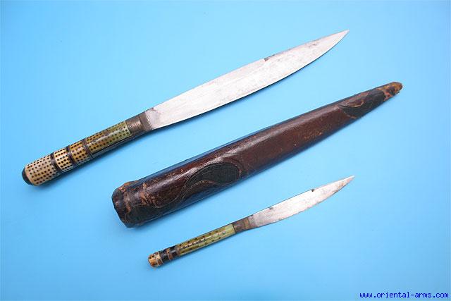 This set of two knives (Trousse) is of Balkan origin, probably Bosnia, late 19 C. The big knife has a massive blade 9 ½ inches long with a 4 inches back edge, The smaller blade is of a similar shape 4 inches long with a 2 inches back edge. The handle of both knives are made of sectors of bones, partially dyed green and set with small brass inserts. Leather covered scabbard. Total length 15 ½ inches. Very good condition. |