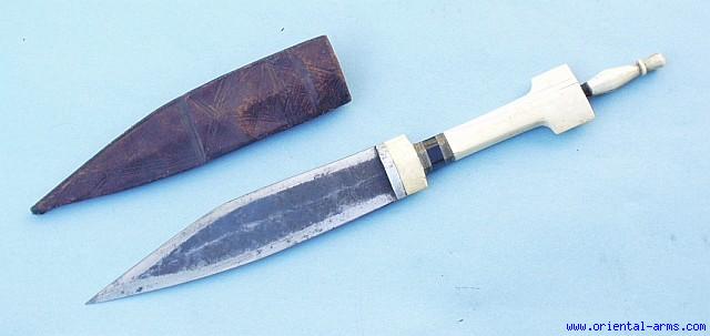 This Billao dagger comes from the coastal people of Somalia. It has a classical but non-symmetrical leaf shape blade, 7 inches long. The handle is made of two sections of ivoey separated by layers of black horn, brass and Aluminum. The pommel is of a typical pronged shape, but bigger than the usual and made from ivory as well. Tooled leather scabbard. Very Good condition.