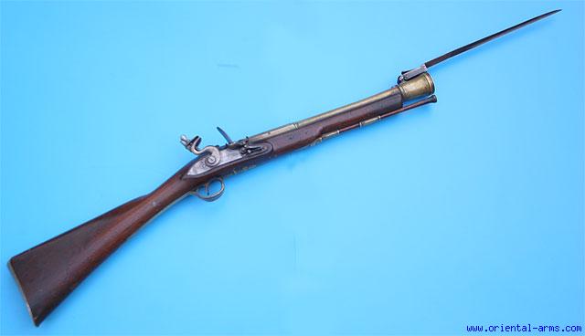 This Blunderbuss is most probably English, mid 19 C. Massive brass barrel signed and marked. Flintlock lock in good working order signed Griffin . Spring operated bayonet of hollow triangular cross section. Total length 29 ½ inches. 41 inches with the bayonet open. Very good condition. Lock hammer partially repaired. |