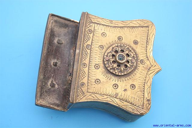 A container to hold bullets, made of heavy brass, 4 inches wide, 4 ½ inches tall with a top hinged lid. Green stone (glass ?) set in the middle of the front face. Turkish origin, late 19 C. Very good condition.
