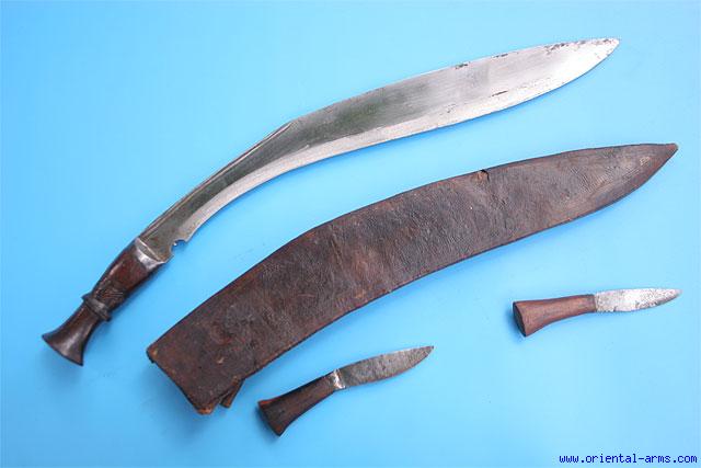 This Khukuri knife is classical Nepalese, late 19 – early 20 C. Long narrow blade, 15 ½ inches long with ridged spine. Wood handle with carved central ring. Leather covered scabbard with back pocket and accompanied knife and steel. Total length 19 inches. Very good condition. Scabbard partially open at the top. |