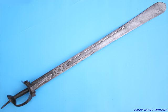 Up for sale is this very good Khanda sword, 18 C. with a 34 inches blade widening to its maximum width of 3 inches just above the tip, which is rounded in a spatula shape. Swords with this form of blade are some time called Patissa. The blade is reinforced with long decorative steel strips on the spine and a shorter one on the ricasso. The basket shape handle is classical Indian ending with a 2 inches pommel spike and the original binding of the grip. Total length 41 inches. Very good condition. The original grip binding is lightly damaged. No scabbard. A fine rare sword. Good shining age patina on all parts |