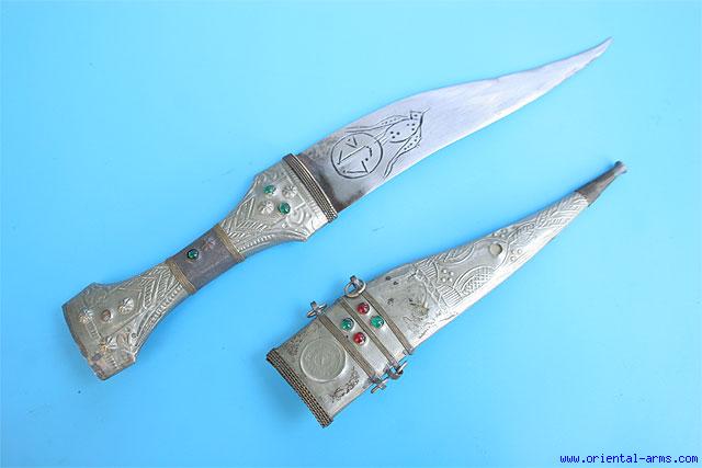 A typical mid 20C. good example of the Bedouin side dagger locally known as Shibriya. All men carry it and it is very popular between the Bedouin tribes residing in Israel and in Jordan. The blade is 6 inches, re-curving and double edged with an acute tip, engraved with a bird and styled Arabic inscription and. The grip as well as the scabbard are covered with chased white metal showing flowers and faces and set with colored stones (glass ?). The scabbard is set with a belt loop at the rear side. Total length 11 ½ inches. Very good condition.