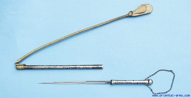 This magnificent riding whip is coming probably from the Caucasus. The silver handle is decorated in Niello, and includes a short daggerof 9 ½ inches long. Total length (open) 35 inches. Superb workmanship probably from the 1920-1930 era. Very good condition.