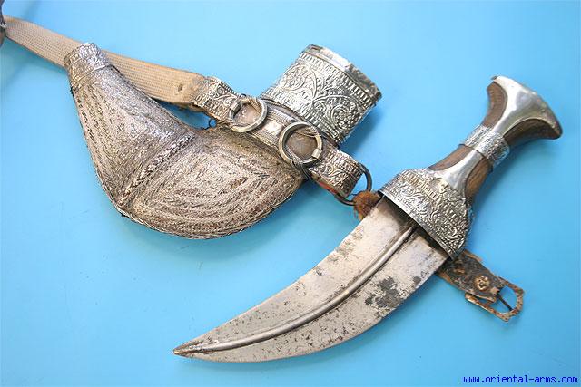 A very good Arab Khnjar / Jambiya dagger, early 20 C. from Oman. It has a 6 ½ inches curved and dual edge well forged blade with a pronounced central rib made from steel strips riveted to the blade. The grip is horn decorated with a silver front panel and mounted with a chased silver collar with gilded strip. The scabbard is “L” shaped covered with leather elaborately embroidered with silver strips and wires, and mounted with chased silver locket and gilded strip en suite with the hilt mounts. The belt attachment is made of complicate arrangements of four rings and twisted silver wire. Total length is 12 inches. Very good condition. |