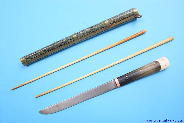 A Chinese ‘trousse’ (eating set), comprising a knife and chopsticks. This type of sets was very common in china and in all the countries under the Chinese influence from Tibet to Mongolia. It was part of a man formal dress up to the turn of the 20th century and usually accompanied with a variety of accessories like pickle spear, toothpicks, tweezers and the like. Similar sets are found in various sizes and quality. This one is of bigger dimensions, 6 inches long (compared to 10-12 inches long in the more common ones), Good, heavy 7 inches blade with ridged spine. Horn grips and ivory pommel end. Scabbard is wood covered with green dyed Sting Ray skin and brass mounts. Ivory chopsticks. Very good condition. |