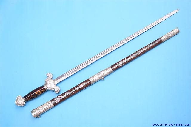 This straight, double edge sword is Vietnamese, early 20 C. , also known as Kiem. Its narrow long well forged blade is 27 inches long nicely fullered. The handle is composed of grip covered with tortoise like material and mounted with big chased silver pommel and cross guard. Wood scabbard with mother of pearl inserts very delicately performed and with beautifully chased silver mounts. Total length 38 inches. Very good condition. The tip of the scabbard is lightly damaged. |