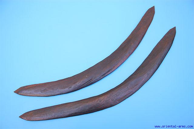 Up for sale is this lot of two almost identical old and real wooden Boomerangs. Dark hardwood, 24 inches long, well made. Very good condition. Good age patina. Minor wood chips.