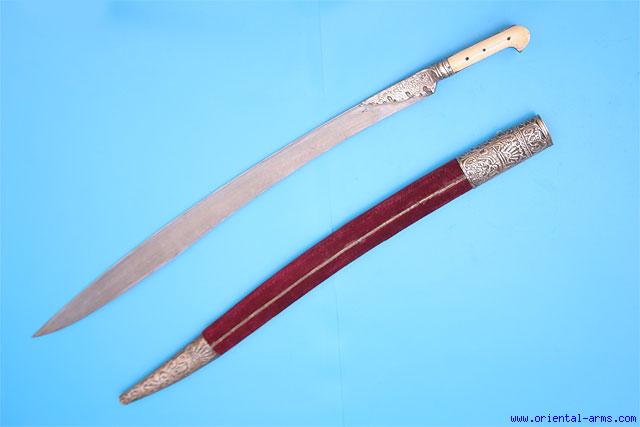 This fine Yataghan sword is Turkish, mid 19 C. Very finely forged blade, twisted steel strips in a pattern known as Turkish ribbon. blade marked with maker mark. Silver bolsters and grip strap and ivory grips. Scabbard covered with red fabric (later) and mounted with nicely chased silver locket and chape. Blade 26 inches, total 32 inches. Very good condition. A very impressive Yataghan sword.
