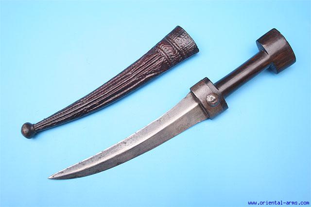 This is a classical Jambiya dagger of the Kurdish people. Probably east Turkey, late 19C. Double edged curved blade with a central rib 8 1/2 inches long. I shaped grip from black hardwood reinforced with a steel collar. Wood scabbard covered with finely tooled leather. Total length 15 1/2 inches. Very good condition. Very minor edge nicks. Very low price |
