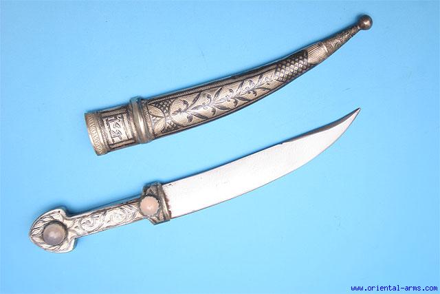 This dagger is of Syrian origin, early to mid 20 C. Single edged, slightly up curving blade with a clipped tip, 5 ½ inches long. White metal handle and scabbard with niello decoration. The handle is set with two round light colored stones. Scabbard back is signed with the maker or owner name. Total length 11 inches. Very good condition. |