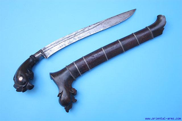 This Sewar knife is from Sumatra late 19C. The blade is massive 9 inches long and 11 mm (almost ½ inch) thick at its base. Slightly down curving, single edged with double fuller. Finely carved bird head black horn handle. Wood scabbard with horn mouth and tip bound with twisted silver wire bands. Total length 13 inches. Very good condition.