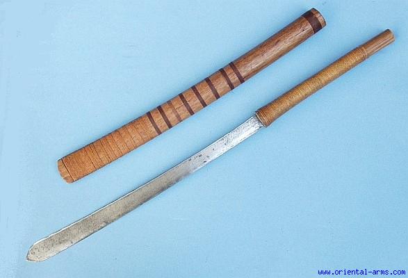 A Classical two handed fighting sword Dha from Burma. The slightly curved heavy blade is 18 ½ inches long with a rounded leaf shapes tip. The grip is wood, 10 inches long and bound with braided rattan rings. Wood scabbard also bound with braided rattan bands. Very good condition. Simple item but of quality fighting blade that probably has seen some battles. Very low price.