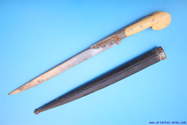 This style of short Yataghan sword is sometimes known as Marine Yataghan, probably because of its length. In contrary to more common Yataghans the blade here is straight with a pronounce T spine, forged from very good high contrast Wootz (Damascus, watered) steel. The grips are walrus ivory with very long and narrow ears. The bolsters and grip strap are silver with granulation work and traces of gold palting. The bolsters are set with drop shaped and ribbed coral stones. Original scabbard with silver locket andchape, covered with the original leather cover with spiral stitches seam. Total length 22 ½ inches. Very good condition. Minor losses to the leather cover of the scabbard. The plugged holes on the grips may indicate a secondary use and/or an early repair of the handle, which is very common in this type of weapons. |