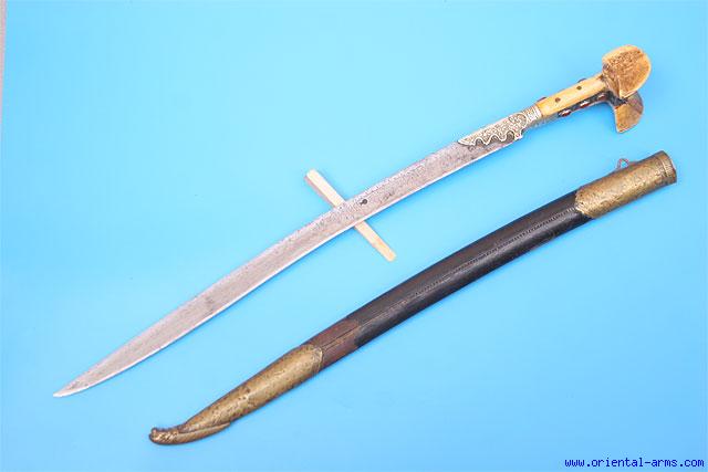 This Yataghan is mid 19 C. from the Balkan region of the Ottoman empire. Good classical blade, 24 inches long marked with maker mark and engraved with Arabic inscription. Walrus grips with very big eared pommel. Silver grip strap set with red stones (Carnelian ?) and gilded silver bolsters. Original scabbard covered with black leather (original cover) with spiral stitching mounted with engraved brass locket and chape. Total length 31 inches. Very good condition. Dark age patina on the ivory with age cracks as common. Small losses to the leather cover of the scabbard. |
