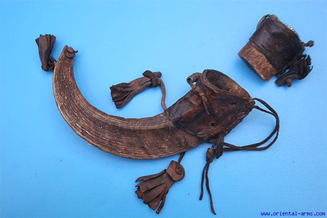 The origin of this powder horn is not precisely known. Probably Arab. Early 20 C. Goat horn filed and bound with leather. Horn plug with filigree silver top set with turquoise stones. Length 8 inches. Very good condition. Few Turquoise stones missing.