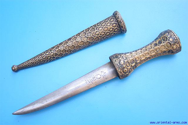 This is a military issue dagger in the shape of an old Ottoman Jambiya from the 16 C (Now in the Topkapi palace museum) These daggers were issued in WW 1, part of the attempt to modern the Ottoman army than under the young Sultan Muhammad V. The blade is 8 inches long heavy, curved and double edged. It has the ‘Tughra’ (the royal stamp) of Muhammad V, the moon and star symbol of the Turkish army, a date 1334, (1915 in the Gregorian calendar) and a serial number 2934 in Arabic figures. On the other side of the blade is a long quote from the Koran. The hilt and scabbard are brass chased in the style of the original dagger. Total length 14 inches. Very good condition. |
