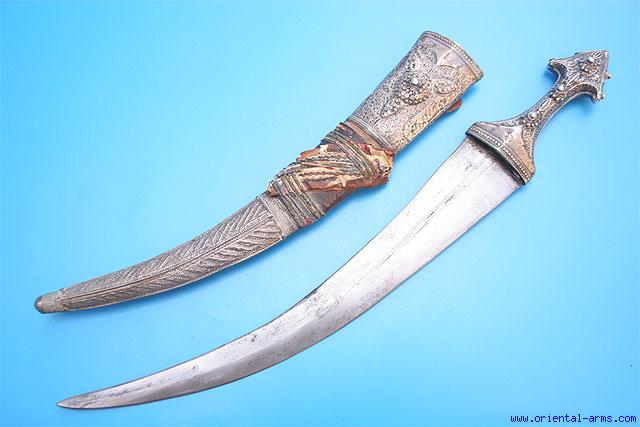 This massive Jambiya dagger is early 20 C. coming from the Western regions of Arabia, Hijaz and Asir. The blade is 17 1/2 inches long, 2 ½ inches wide and very well forged. Finely chased heavy silver handle and scabbard mounts with the remains of the original belt made from colored leather strips. Total length 24 inches. Very good condition. A massive and very impressive dagger.