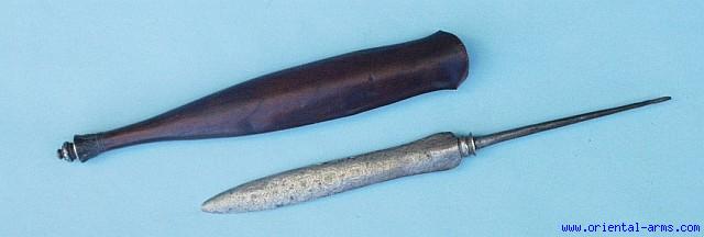 We offer here for sale a very good spear head of Indonesian origin, with its original scabbard. Excellent 10 inches blade of very distinct pamor pattern. Dark Wood scabbard set with silver top. Total length in scabbard is 22 ½ inches. All in very good condition, only some of the silver decoration on one side is missing. |