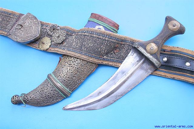 This type of Jambiya dagger from Yemen is also known as Thouma and it is probably coming from Sana’a. Original old blade 7 ½ inches long, with a pronounced central rib. Horn handle decorated with brass imitation coins. Heavy brass scabbard. Original wide brocade belt with silver and brass decorations (some later repairs). Total length 13 inches. Good condition. Low price.
