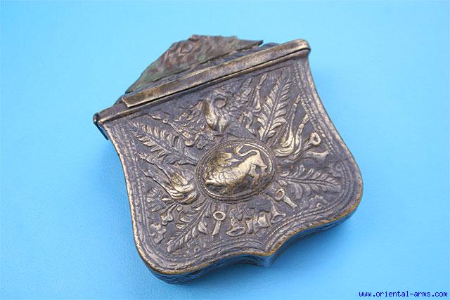 A container to hold bullets, made of heavy brass, 4 inches wide, 4 ½ inches tall with a top hinged lid. Late 19 C. Very good condition. Minor damage to the lid corner.