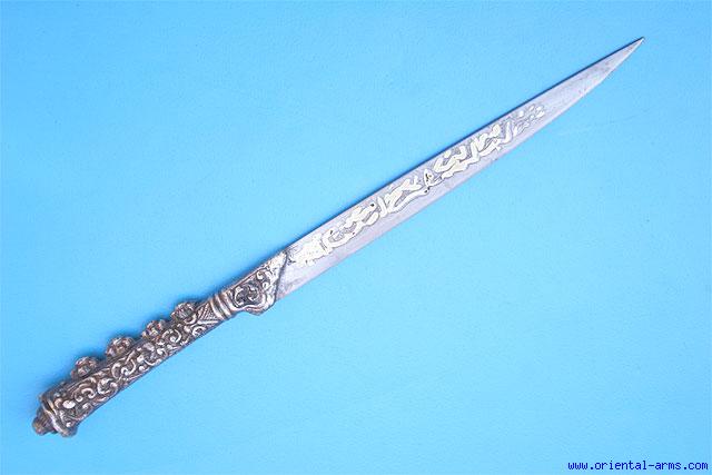 Up for sale is this small kard knife, mid to late 19 C., from the Balkan area of the Ottoman Empire or possibly Greek. Single edged blade 6 inches long with Arabic letters in brass inlaid into it. Silver covered handle in a Greek typical style. Total length 9 ½ inches. Very god condition. No scabbard. |