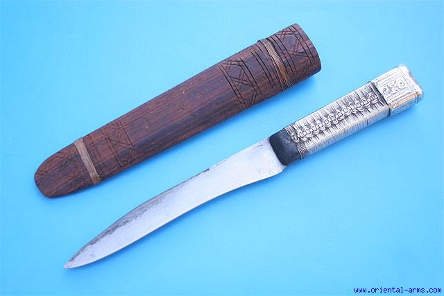 This knife is most probably a Shafra or Kusha. It is carried in attached to the rear side of the wide belt behind the Jambiya (Khanjar) dagger and found all over the Arabian peninsula in varying shapes. Here is an unusual example: The blade is 6 ½ inches long, slightly down curving and probably re shaped from an older utility knife . The grip is wood bound with silver wire and mounted with a chased silver pommel. Later wood scabbard. Total length 12 ½ inches. Very good condition. |