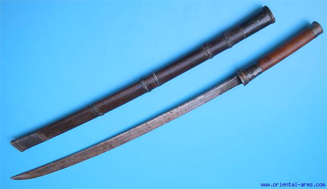 This short dah sword is Burmese, late 19 C. Very good blade with ridges spine, 20 ½ inches long. Wood grip with silver mounts. Wood scabbard with silver bands with filigree decoration. Total length 28 inches. Good condition. Minor pitted spots on the blade with tip slightly re shaped. Pommel cover is restored. Very low price. |