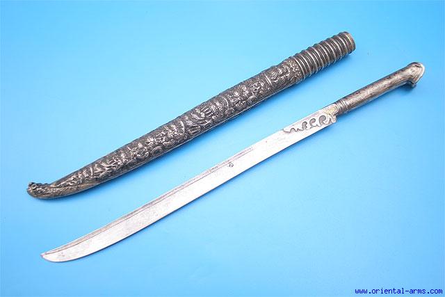 We offer for sale this fine and complete Yataghan Sword. The blade is 15 1/2 inches long, finely fullered and marked with a maker mark. Silver handle partly gilded and decorated with niello design. Very finely chased whole silver heavy scabbard. Total length 22 inches. Very good condition. Minor dents on the grips. |