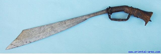 We are offering here for sale a very rare sword from the Maluku (Moluccas) islands. It is from the Klewang family but of a rare form. The blade is heavy, 23 inches long with a clipped at it widest point (3 inches) near the tip. The blade is forged from laminated steel. The handle is hardwood and the guard is horn bound to the handle with rattan fibers. The grip is bound with braided rattan. Total length 31 inches. Very good condition. Minor darkened spots on the blade and a very few of the rattan binding strips are torn. A very similar sword is shown in: A.G. Van Zonneveld Traditional Weapons of the Indonesian Archipelago P. 70 Fig. 261. A rare find. |