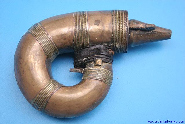 Up for sale is this powder flask, Arab origin, late 19 C. made of brass. 9 X 5 ½ inches. Brass wires decoration. Very good condition. Some later solder repairs. Very Low Price.