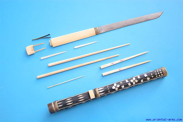 A Chinese ‘trousse’ (eating set), comprising a knife and chopsticks. This type of sets was very common in china and in all the countries under the Chinese influence from Tibet to Mongolia. It was part of a man formal dress up to the turn of the 20th century and usually accompanied with a variety of accessories like pickle spear, toothpicks, tweezers and the like. Similar sets are found in various sizes and quality. This one is a very fine one. The blade is 5 inches long very well forged and nicely fullered. Ivory grip with removable pommel, revealing miniature brass tweezers. Wood scabbard, Finely black lacquered with ivory and mother of pearl inserts and finely chiseled brass mounts. Two sets of ivory chopsticks and several ivory toothpicks etc. Total length 11 inches. Very good condition.